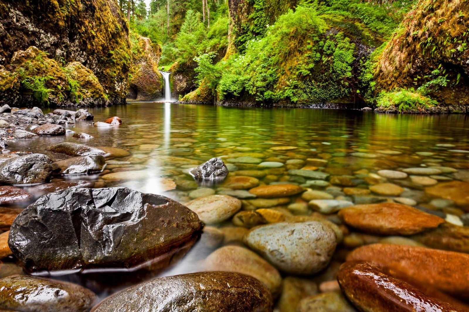 Punch Bowl Falls along the Eagle Creek Trail in Oregon with focuPunch Bowl Falls along the Eagle Creek Trail in Oregon with focus on the rocks in the foreground